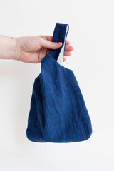 This is a Tsuno bag made from scrap fabric. A Tsuno bag is a type of Japanese-inspired tote bag, named "Tsuno" (meaning "horn") for its long, pointed handles that are tied together to form a knot for carrying.