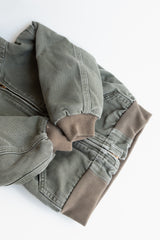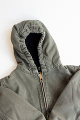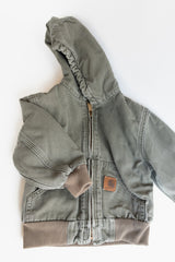 Green Carhartt workwear hooded jacket with flannel lining inside.
