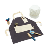 Introduce children to the joy of cooking! The Chef Set includes easy-grip cooking tools that are designed for small hands with big appetites. This set includes 1 adjustable apron, 1 adjustable chef hat, 1 blow torch with a functioning knob, 1 spatula, 1 knife, 1 tasting spoon, and 1 meat tenderizer. Expand upon this set with other PlanToys kitchenware as a young chef discovers all the possibilities of pretend-play cooking.