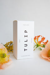 Tulip: Tulip is a perfumed, organic soap — crafted with pure vegetable oils. Imagine if you will the freshly harvested bouquet: Still cool from outdoors, with close-fitting petals and watery stalks that make a slight squeaking sound when handled. This is our tulip perfume, floral yet cautious. As if it is keeping watch over its promise.