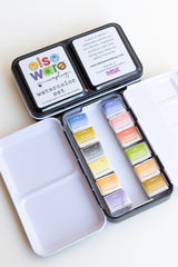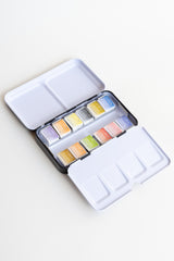 Our assortment of 12 pans of vibrant watercolor paints packed into an eco-friendly aluminum case are the perfect size for travel and plein air applications. Plenty of interior wells for rehydrating the cakes of color with water, but small enough to slip into a backpack or tote bag. Discover the beauty of fast drying, translucent watercolors, a medium known for its spontaneity and clarity. Paintbrush not included.