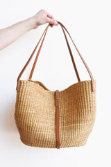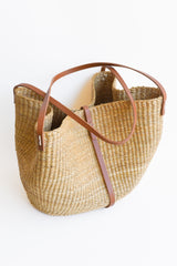 Handwoven bag in unique shape with double leather handles and a leather and metal closure.