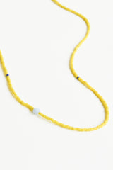 Like a little light you can wear. The Sunshine Necklace by Fond Jewelry is strung with bright, joyful yellow beads and dotted with unexpected pops of blue, like a clear sky breaking through a summer morning. Made in South Philadelphia using repurposed vintage and gemstone beads, each necklace is a one-of-a-kind creation from local artist Fond Jewelry.
