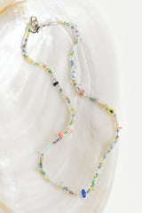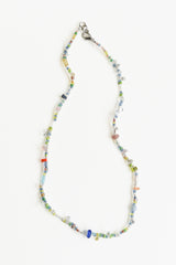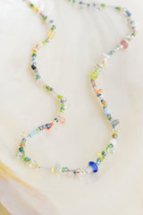A joyful jumble of memory, color, and texture, each Eye Spy Necklace is a one-of-a-kind adventure in bead form. Hand-strung by South Philly artist Fond Jewelry, this piece is a tapestry of the past and present: gemstone chips, vintage glass, seed beads, and cherished finds from the artist’s childhood collection all come together in a perfectly balanced, beautifully intricate design. No two are alike.