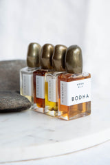 Founded in 2014, Bodha is creating a new world of therapeutic perfumery to help you come back to yourself through the power of scent. 15ml roller bottle with hand-cast bronze lid. Made in Los Angeles with vegan and sustainably sourced ingredients.