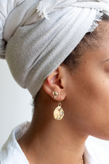 Inspired by the luminous crescent moon in the night's sky, these earrings feature raw rose quartz set in brass and suspended from meticulously handcrafted gold-filled ear wires. Versatile yet enchanting, these earrings are a perfect addition to any outfit. Our metals are ethically sourced and carefully crafted to minimize waste, while our gemstones are directly procured from mines, maintaining their natural allure without any chemical enhancements. In our pursuit of sustainability, we prioritize eco-friendly options and our packaging is made of 100% recycled paper. As a premium brand, we ensure elegance and exclusivity in every aspect.
