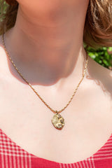 Imagining a glimmering crescent moon in the night sky, our Emilie Shapiro Crescent Pendant features rough rose quartz embedded in brass, anchored on our signature brass chain with a handmade clasp. Growing up near the Atlantic Ocean, water has always been Emilie's constant inspiration. Coming from a family of creative entrepreneurs, inventors, and free spirits, she has explored different artistic mediums throughout her life. Employing the ancient craft of lost wax casting, derived from the Egyptians, Emilie carved sculptural pieces into hard wax and cast them into metal. She incorporates rough gemstones as a tribute to the natural beauty of imperfection. All production and resources are locally sourced, and each piece is carefully handcrafted in Emilie's studio in New York City. She resides in Astoria, Queens with her husband, son, and two cats. In her free time, Emilie tends to her garden, knits, and obsesses over her plants.