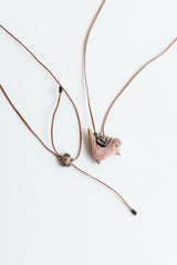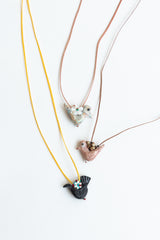 Carved stone bird with mother of pearl flower & tiny silver details. Soft brown nylon, pearl flower button closure. 26" adjustable Available in Bluebird or Winter Brown Stone.