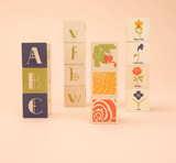 Enjoy a bouquet of 14 exquisite flowers. One side of each block reveals a closeup of the flower featured on its opposite. Colorful Art Nouveau letters grace the remaining sides. See and feel two debossed letters on each block. This set contains an extra A and E, as well as printed lowercase letters.