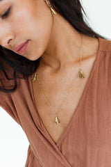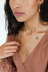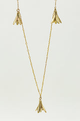 Three hand-carved brass seed pods floating on a gold fill link chain.