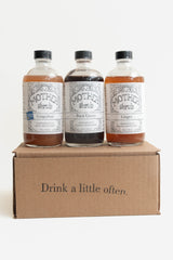 The MOTHER shrub Trio Box contains three 4oz bottles in combinations of our popular and award-winning flavors. Each hand stamped box comes with a recipe card for cocktails and mocktails, and has a back label displaying the contents of the box. Perfect for gifting or tasting!