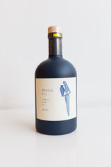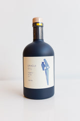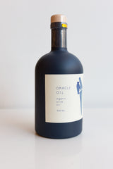 Oracle is packaged in a navy-blue bottle designed by the L.A. artist Alejandro Cardenas, and UV-coated to prevent any oxidation of the oil through light exposure. Each bottle is filled and sealed in Laconia and labeled with a date of harvest.