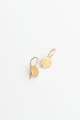 Hand formed golden coins with flower stamping detail, brushed satin finish, 24 karat gold over sterling silver. 1 1/8"