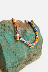 Festive multi-colored glass beads are strung alongside scattered brass blossoms. This bracelet is a perfect splash of color to heighten your spirits. Perfect to layer with.