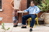 Ondo started as a way to honor damaged or discarded clothes from around Philadelphia. Each piece is one of a kind and handcrafted by Jess Larson and Autumn Ondo. Their sashiko inspired mends use 100% cotton thread and linocut stamps are hand carved and printed. Each print is heat set. Fading or inconsistencies in boldness can be expected.