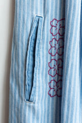Ondo started as a way to honor damaged or discarded clothes from around Philadelphia. Each piece is one of a kind and handcrafted by Jess Larson and Autumn Ondo. Their sashiko inspired mends use 100% cotton thread and linocut stamps are hand carved and printed. Each print is heat set. Fading or inconsistencies in boldness can be expected.