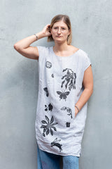 Ondo started as a way to honor damaged or discarded clothes from around Philadelphia. Each piece is one of a kind and handcrafted by Jess Larson and Autumn Ondo. Their sashiko inspired mends use 100% cotton thread and linocut stamps are hand carved and printed. Each print is heat set. Fading or inconsistencies in boldness can be expected.