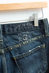 Ondo started as a way to honor damaged or discarded clothes from around Philadelphia. Each piece is one of a kind and handcrafted by Jess Larson and Autumn Ondo. Their sashiko inspired mends use 100% cotton thread and linocut stamps are hand carved and printed. Each print is heat set. Fading or inconsistencies in boldness can be expected.