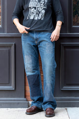 Ondo started as a way to honor damaged or discarded clothes from around Philadelphia. Each piece is one of a kind and handcrafted by Jess Larson and Autumn Ondo. Their sashiko inspired mends use 100% cotton thread and linocut stamps are hand carved and printed. Each print is heat set. Fading or inconsistencies in boldness can be expected.