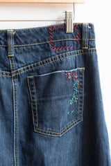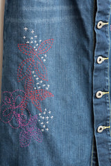 Ondo started as a way to honor damaged or discarded clothes from around Philadelphia. Each piece is one of a kind and handcrafted by Jess Larson and Autumn Ondo. Their sashiko inspired mends use 100% cotton thread and linocut stamps are hand carved and printed. Each print is heat set. Fading or inconsistencies in boldness can be expected.
