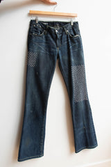 Ondo started as a way to honor damaged or discarded clothes from around Philadelphia. Each piece is one of a kind and handcrafted by Jess Larson and Autumn Ondo. Their sashiko inspired mends use 100% cotton thread and linocut stamps are hand carved and printed. Each print is heat set. Fading or inconsistencies in boldness can be expected.