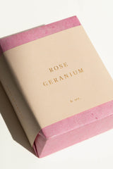 An intoxicating and uplifting floral essential oil blend focusing on rose geranium. Contains saponified oils of olive, coconut, and castor, with shea butter and essential oils.
